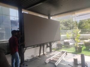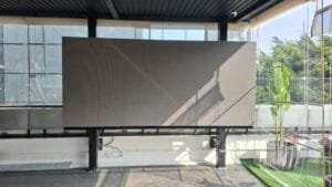 The LED screen (3200 × 1512 mm) is installed under the terrace on a pole-mounted steel structure with back-mounted support arrangement.